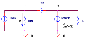 Gain beta = I(RL) / I(ISIG) Are they close to the values we calculated above? HANDS-ON DESIGN Let's play with this circuit a bit. Try lowering the cutoff frequency by increasing CC from 30 pF to something like 300 pF and plot V(2). Does fc drop by the approximately same factor as CC's increase? Now, reduce the Miller effect by decreasing RL from 5000 to 500 effectively dropping the voltage gain. What happen to the CM and fc now?