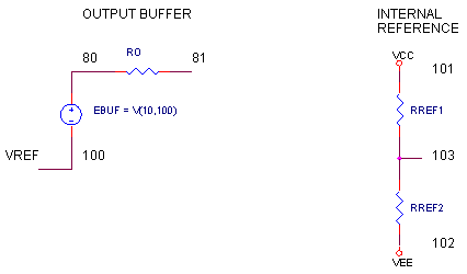 SPICE FILE Download the file or copy this netlist into a text file with the *.cir extension. OPMODEL3_2ND_GAIN_STAGE - OPAMP MODEL WITH 2ND GAIN STAGE.CIR * * SIGNAL SOURCE VS 1 0 AC 1 PWL(0US 0V 0.01US 1V 100US 1V) * * POWER SUPPLIES VCC 10 0 DC +15V VEE 11 0 DC -15V * *R1 0 2 1 R2 2 3 1 XOP 1 2 3 10 11 OPAMP3 RL 3 0 100K * * OPAMP MACRO-MODEL 3 - ADDITIONAL GAIN STAGE * * IN+ IN- OUT VCC VEE .SUBCKT OPAMP3 1 2 81 101 102 Q1 5 1 7 NPN Q2 6 2 8 NPN RC1 101 5 151.7 RC2 101 6 151.7 RE1 7 4 100 RE2 8 4 100 I1 4 102 0.001 * * ADDED GAIN STAGE GV 100 15 6 5 0.001 RV 15 100 200K * CLAMP FOR SLEW-RATE LIMITING DZ1 15 16 DZENER DZ2 100 16 DZENER * * GAIN, FIRST-POLE AND SLEW RATE G1 100 10 15 100 0.0005 RP1 10 100 1MEG CP1 10 100 79.6PF * *OUTPUT STAGE EOUT 80 100 10 100 1 RO 80 81 100 * * INTERNAL REFERENCE RREF1 101 103 100K RREF2 103 102 100K EREF 100 0 103 0 1 R100 100 0 1MEG * .MODEL NPN NPN(BF=50000) .MODEL DZENER D(BV=5.7V IS=1E-14 IBV=1E-3) * .ENDS * * ANALYSIS .TRAN 0.001US 0.2US .AC DEC 5 1HZ 1000MEGHZ * * VIEW RESULTS .PRINT TRAN V(3) .PRINT AC V(3) .PROBE .END