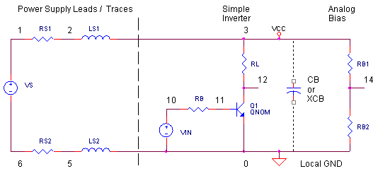 SPICE FILE Download the file or copy this netlist into a text file with the *.cir extention. CBYPASS.CIR - POWER SUPPLY BYPASS CAPACITOR * * POWER SUPPLY VS 1 6 DC 5 * POWER SUPPLY LEADS / TRACES RS1 1 2 0.01 LS1 2 3 20NH LS2 0 5 20NH RS2 5 6 0.01 * * SIMPLE INVERTER CIRCUIT VIN 10 0 PULSE(0 5 0 10NS 10NS 90NS 200NS) RB 10 11 5K Q1 12 11 0 QNOM RL 3 12 200 * * ANALOG BIAS / REFERENCE VOLTAGE RB1 3 14 5000 RB2 14 0 5000 * * BYPASS CAPACITOR *CB 3 0 0.1UF *XCB 3 0 C105 * * 0.1 UF CAPACITOR MODEL - INCLUDES ESR AND SELF-RESONANCE .SUBCKT C104 1 4 * FO = 10 MHZ C 1 2 0.1UF R 2 3 0.08OHMS L 3 4 2.53NH .ENDS * * 1 UF CAPACITOR MODEL - INCLUDES ESR AND SELF-RESONANCE .SUBCKT C105 1 4 * FO = 1 MEG HZ C 1 2 1UF R 2 3 0.03OHMS L 3 4 25.3NH .ENDS * .model QNOM NPN * * ANALYSIS .TRAN 1NS 200NS * VIEW RESULTS .PRINT TRAN V(3) V(12) I(LS1) .PLOT TRAN V(3) V(12) I(LS1) .PROBE .END